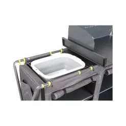 Create the perfect camping or glamping set up with the Wanderer Premium Camp Kitchen! The all-in-one solution to your camp kitchen woes. Designed with a quick and easy to assemble X shape frame, you’ll be ready to cook up a storm in no time. The two hanging storage cupboards are handy spots for your utensils, condiments and dry food supplies, whilst the aluminium slat top with wind shield helps to keep your fire burning. A foldable basin is included for easy wash up after dinner, with the whole camp kitchen folding up into a handy carry bag when you’re ready to head home.